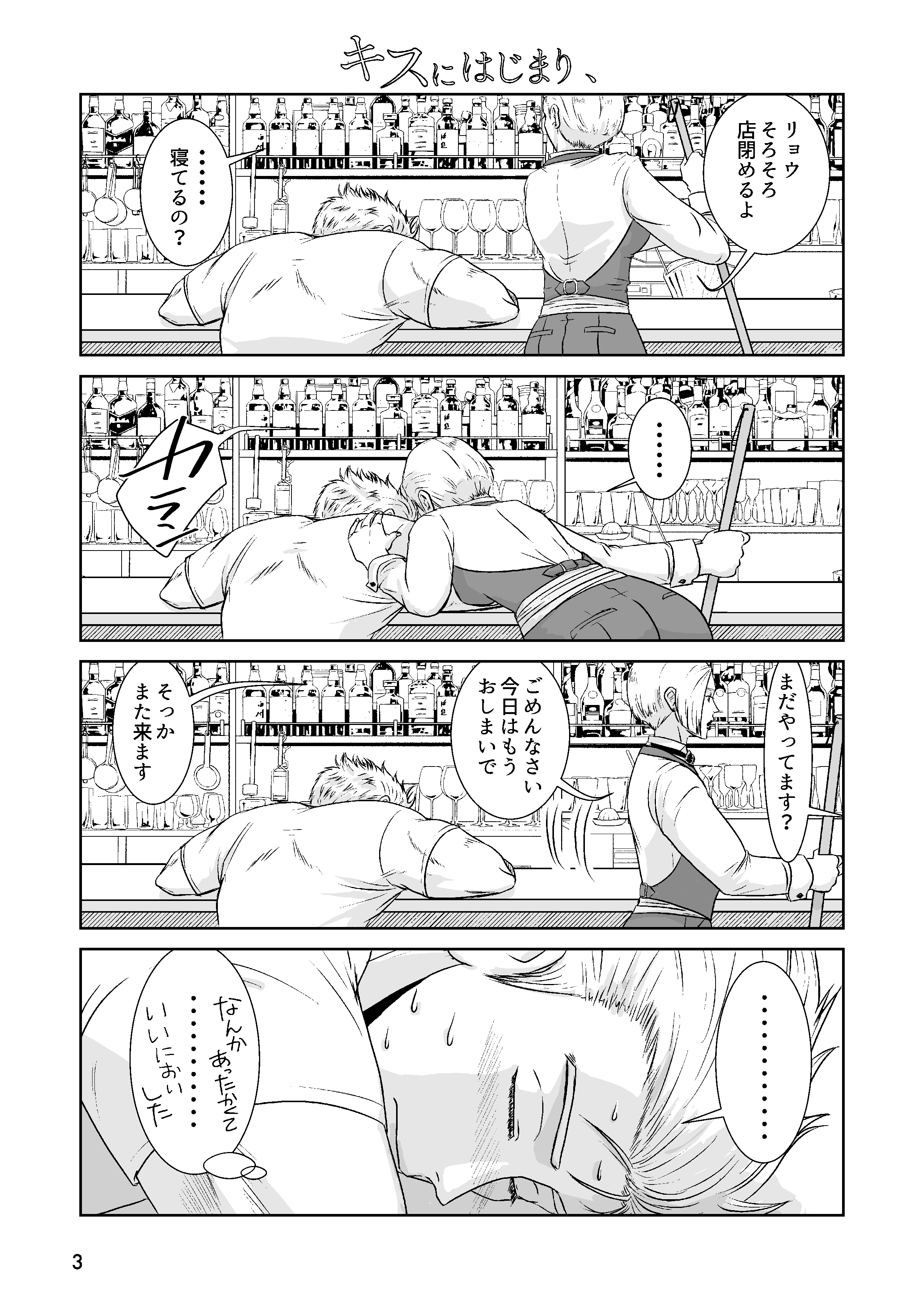 2023年10月ごろにいただいたお題「壁ドンと顎クイ」から描かせていただいた1ページ漫画を4ページに拡大したものです。よくよく考えると2022年のキスの日にアップした小ネタから転用している部分もあり、両方のシンクロナイズド作品と言えるかもしれません。私の頭の中のおっさんリョウ(おっさんと言っても32歳くらいだけど)はこのくらいエロいし上手いこと言います。という漫画。