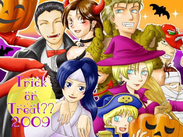 左上から順に、ロバート=ドラキュラ、ユリ=デビル、リョウ=ワーウルフ、タクマ=天狗(そのままじゃねーか!)、香澄=幽霊、ジャン=海賊、キング=魔女、影二=ミイラ男。です。