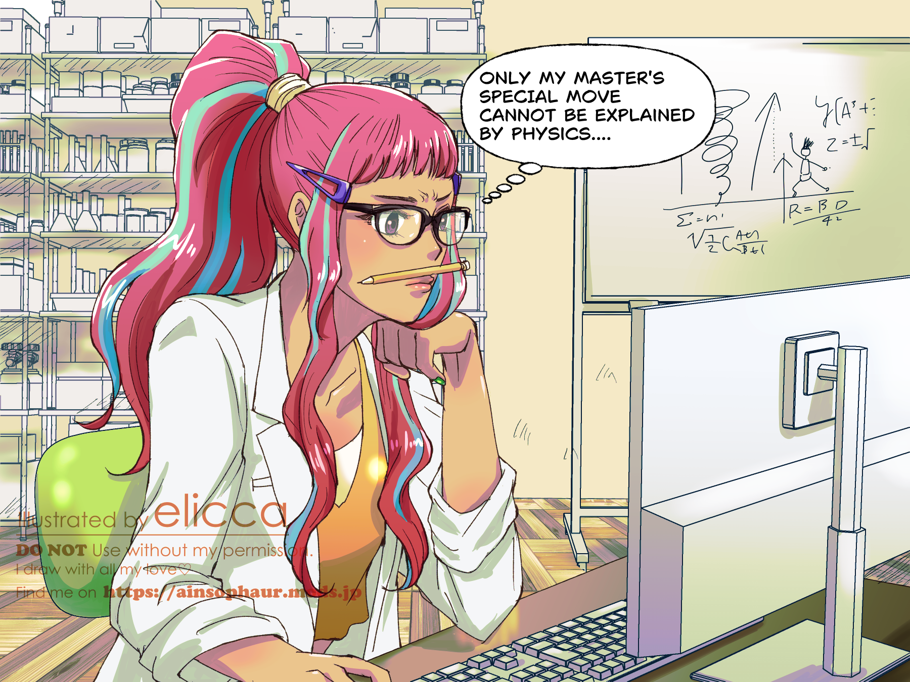 「師匠の技だけ物理で解明できない」と首を傾げるプリチャ。たくさんの方に見ていただけ、SNKの方にも見ていただけて恐縮しきりの一枚。仕上げにグラデーションマップを使っていい感じになった。背景は全部素材です。素材偉大。(202511.28 Xで初出)