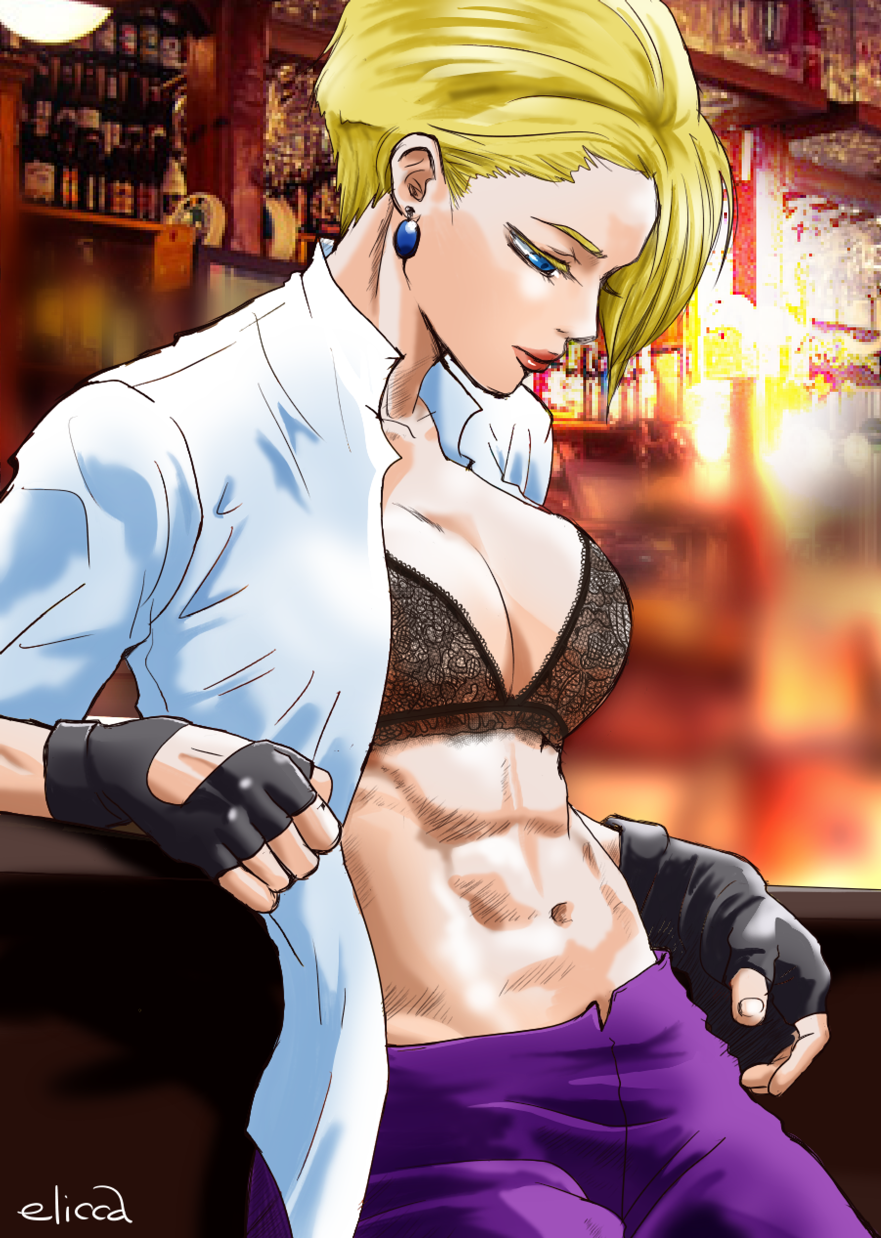 KOFの脱衣KOそろそろおしまいにしようやあ…時代の流れ的に…って個人的には思ってるんすけど、そもそもキングさんたちが普通のツルッとした下着みたいなの着てるのが全然納得いかなくて、そんなもんスポーツブラ着てるに決まってんだろって思いながら描いた絵。でも結局ランジェリーバージョンも差分で描いたという。