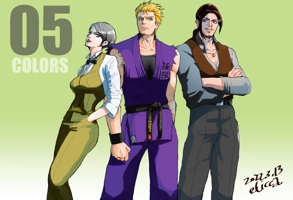 リリース後に実際KOF15で遊んでたら、昔から好きだった白道着リョウと他の二人も白で揃えられることに気づき、途中からほとんどこのカラーリングでばかり遊んでました。ってことを言いたくて色だけ差し替えてtwitterにアップしたらやっつけ仕事感漂うイラストなのにも関わらず結構いろんな方が見てくださってとてもびっくり&嬉しい限りでした。(2022.3.12 twitterで初出)