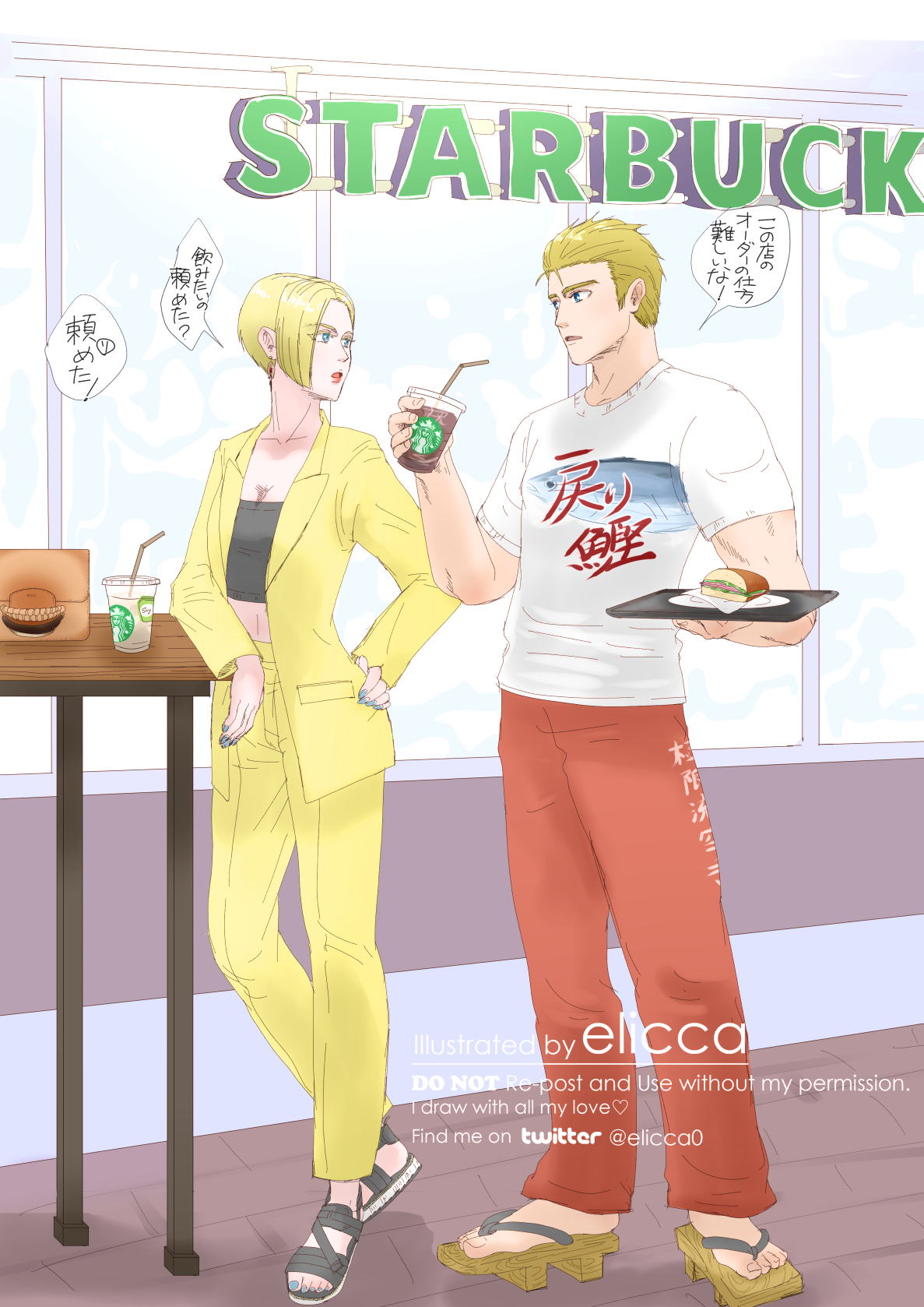 これもtwitterで相互フォローしてくださっている方の「ハイブランドでキメたキングさんの横にデカデカと日本語が書いてあるクソダサトンパチTシャツ+下駄ルックのリョウがいてほしい」というツイートが最高過ぎて勝手に描かせていただいたイラスト。