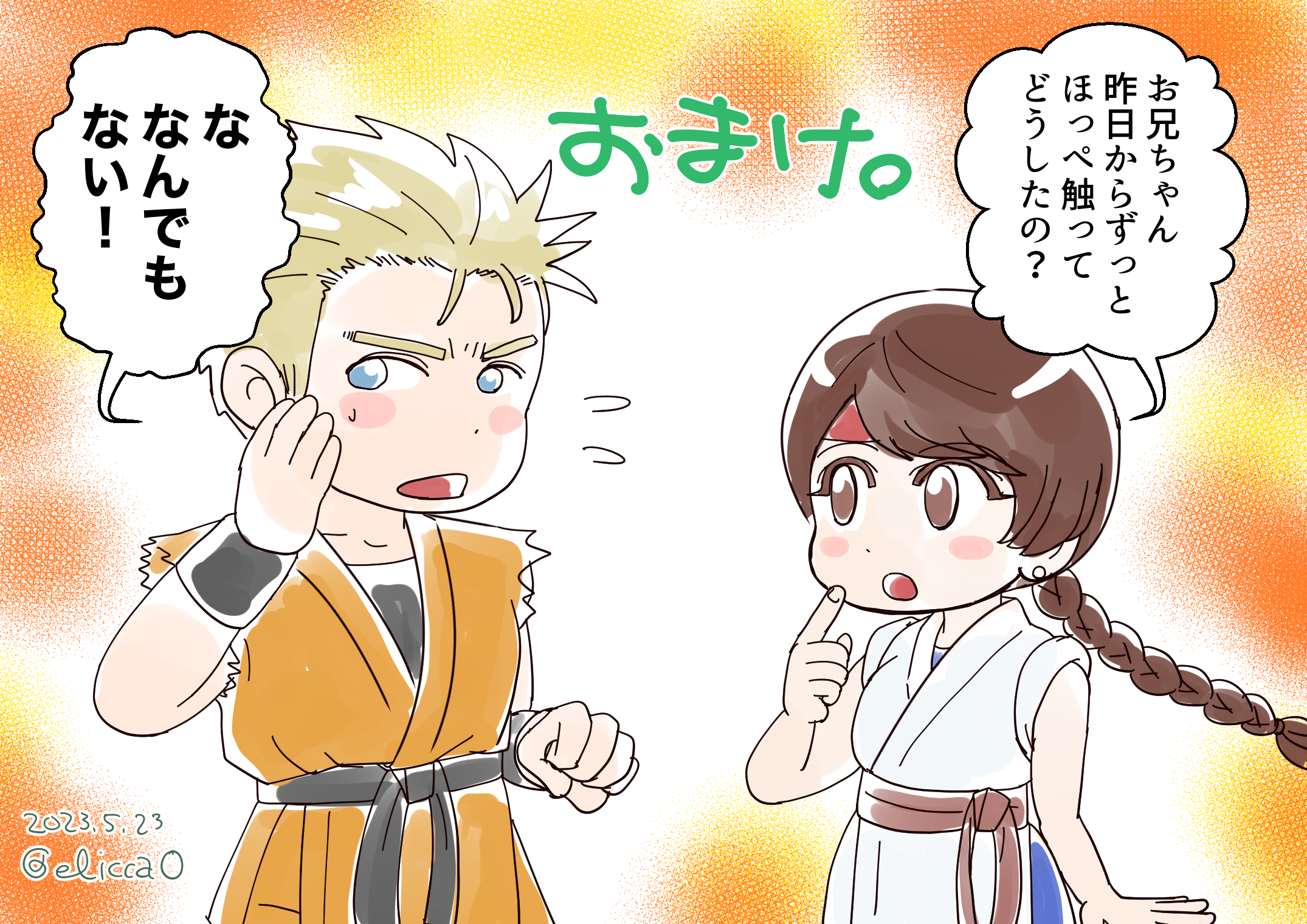月一の推し活。最初はもっとメロウなイチャイチャを描こうと思ったんだけどそうせず、KOF15のパオパオカフェで健闘を称え合う二人にしようかと思ったけどそうもせず、なんか中途半端なイラストになってしまった。けど二人の髪の毛の塗り方とか、過去の自分のイラストとは少し違う塗り方にできて満足しています。鼻の形を最近変えてみてるんだけど、どうかな〜前の方がいいかなあ。なんかよく分かんなくて難しいね。(2023.6.22 twitterにアップ)