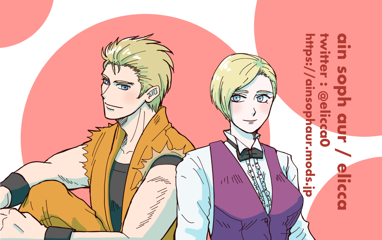 この2枚のうち、リョウとキングさんのイラストを当初は新刊のサンキューカードにしようとしていたんだけど、下絵があんまり気に入らなくて作業が止まってしまっていました。後から描いたサークルカットをサンキューカードにし、このイラストが浮いてしまったので、頑張って仕上げてネップリにしました。華やかでいい感じになったのではなかろうか。