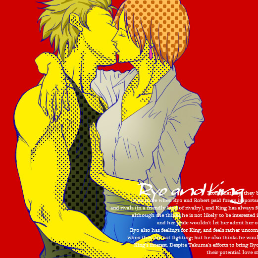 ちゃんとレイヤー分けをしてイラストを描くぞという気概のもとに描いたイラストたち。1枚目のイラストが一番好きかも。人体崩壊してるけど。KOF11の龍虎Tのエンディングは結構衝撃で、それ見たさにPS2買った感じでした。あのEDのポイントはちゃんとリョウも頬染めてるところです。ちゃんとリョウもキングさんを意識してぎこちなくなってるとこが!!!!最高の!!!!ポイントなんです!!!!テストに出ます!!!!