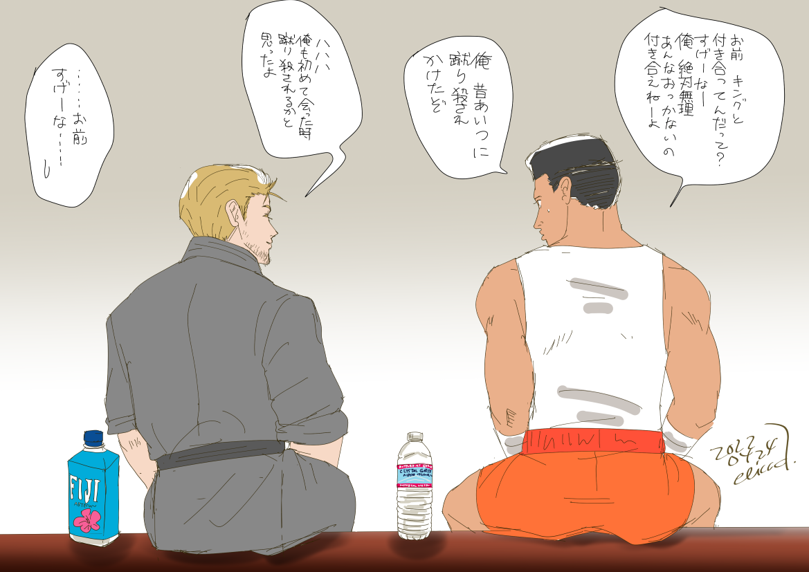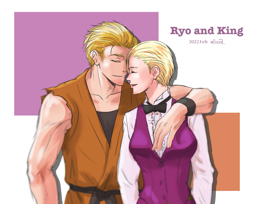 BURIKI世界でのリョウとキングはリョウいわく「良い友達、店にもよく行く」ってことなので、もうこれは完全に良い仲になってるだろと解釈しているんですけど、そして年齢も年齢なのでそろそろ結婚するんでしょって思ってるんですけど、という絵。完全に非公式だけどこの世界の二人が一番大好きで大好きで私はもうどうしたら良いのか…と描くたびに胸を熱くしている。円熟して人間としても武道家としても完成されつつある坂崎亮という男と、彼と10年近くつかず離れず友人づきあいを続けてきたキングという女性、すごくバランスがよくてだいしゅきすぎるから早くMotWの続編あたりで公式に結婚してることにしてください。MotWの続編でプレイアブルキャラクターとして登場するMr.KARATEのプロフィールあたりで「大事なもの:極限流と家族(妻と子供)」とかさらっと書いといてほしい。(オタク特有の早口で) (2022.3.17 twitterで初出)