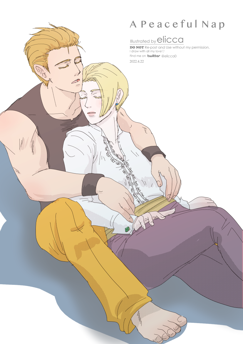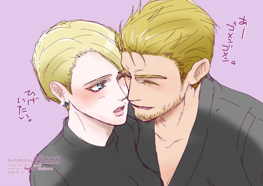 本当はクリスマスくらいに雪景色と一緒にアップできたら良いなって思ってラフを切ってたんだけど、気がついたら冬が終わってたからもう良いやってことで人物だけザクっと描いてアップしたイラスト。このくらいからtwitterにリョウキンイラストをアップすると200くらいいいねをいただけるようになってきて、ゲームの人気をひしひしと感じるようになった。原作だと全然こんな感じにならないけど早くイチャイチャしてくれと、毎日のように思っています。(2022.2.6 twitterで初出)