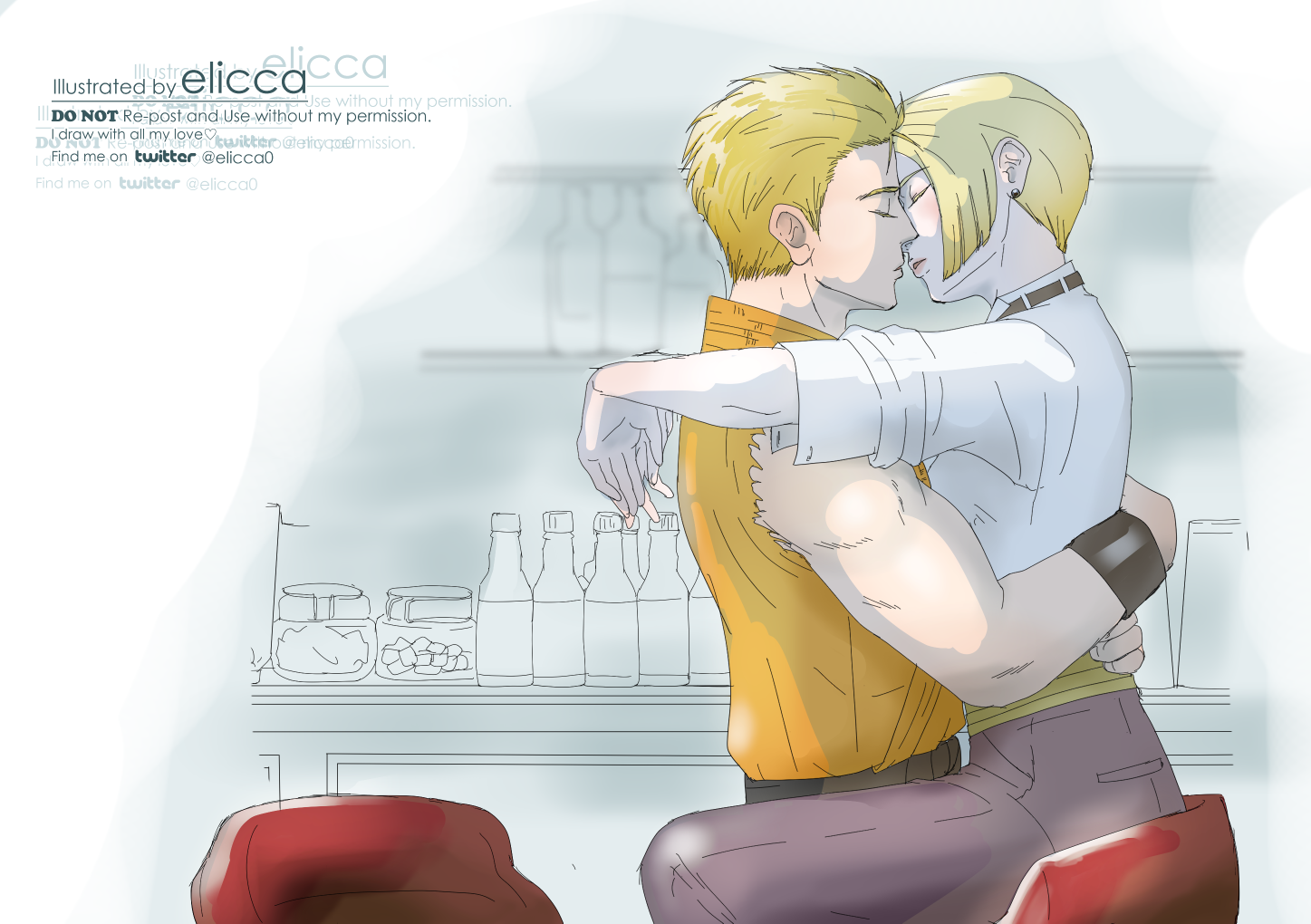 オタ活も2年目になり、去年に引き続いてキスの日というテーマで一枚描きました。閉店後のイリュージョン的なシチュエーションを妄想。イリュージョンにオレンジ道着で来たら笑っちゃうんだけどご都合主義でデフォルトのコスチュームです。